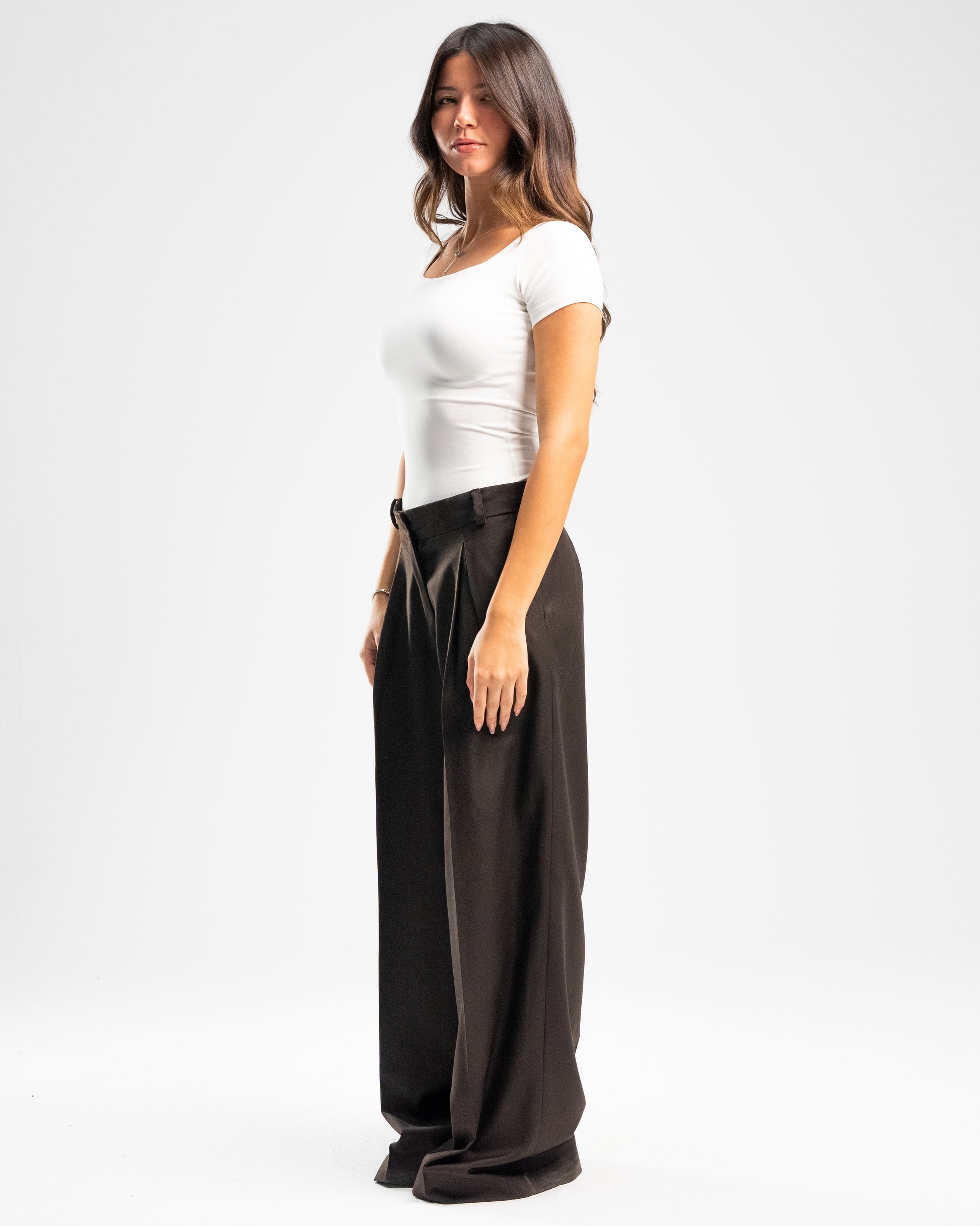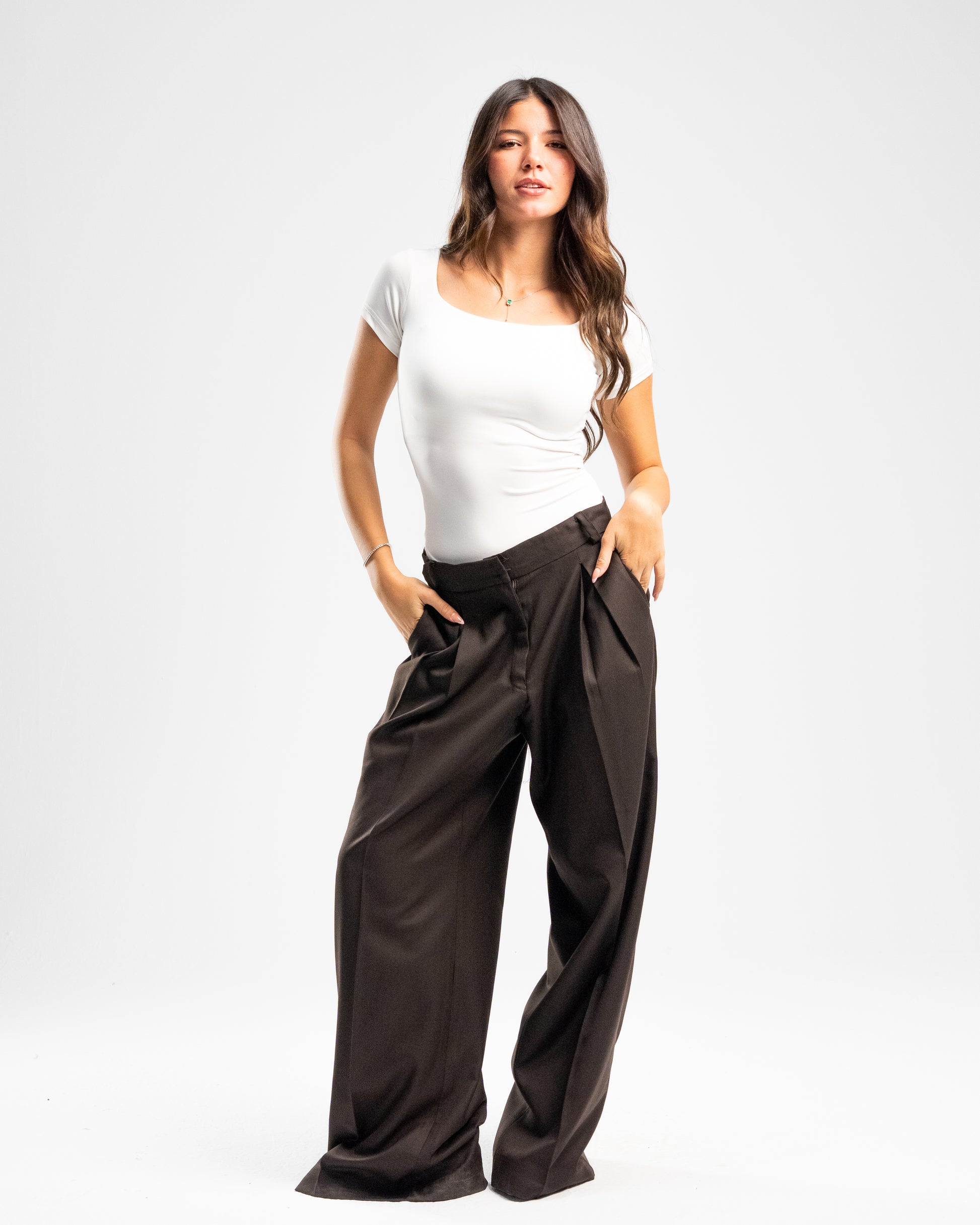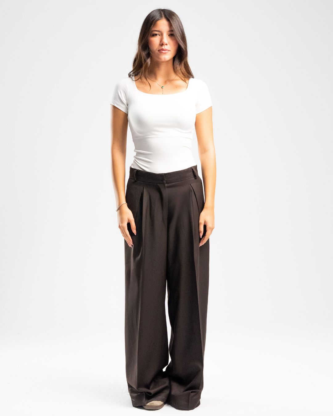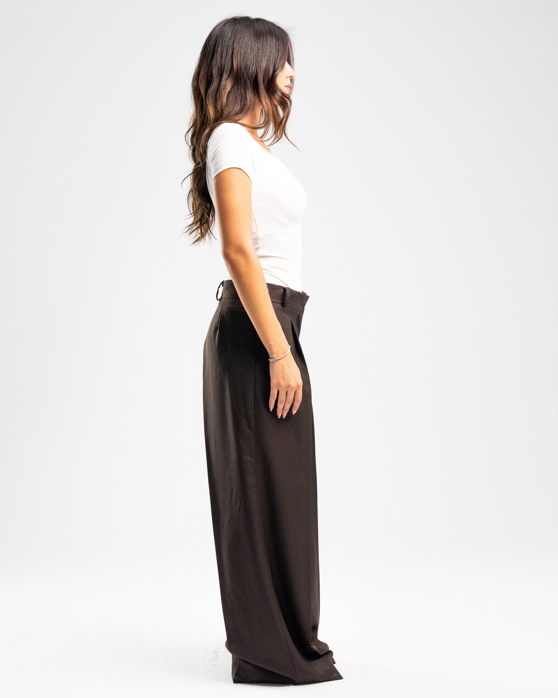 Mariem (173 cm) is wearing the Mocha Pleated trousers in size Small-Medium.